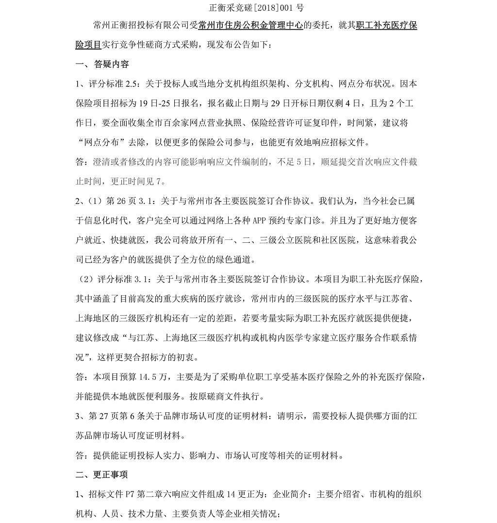 常州市住房公積金管理中心職工補充醫(yī)療保險項目 答疑、更正公告